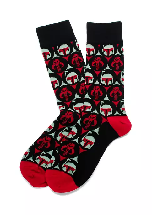Rows of green Boba Fett helmets and red Mandalorian symbols march across the surface of these socks. The toe seams are reinforced for extra strength and a cushiony-soft black band helps keep your socks in their proper place. Officially licensed by Lucasfilm LTD.