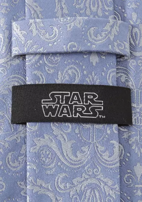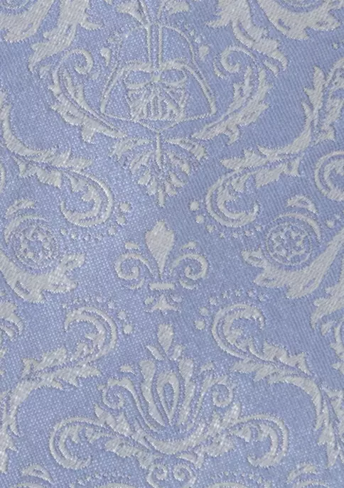 Who says fandom has to be noisy? Enjoy the finer things in life with this sophisticated 100% silk china blue tie. Elegant feather and leaf scrolls form a pattern around Darth Vader’s helmet, and small Imperial icons unfurl neatly to finish the look. Officially licensed by Lucasfilm LTD.