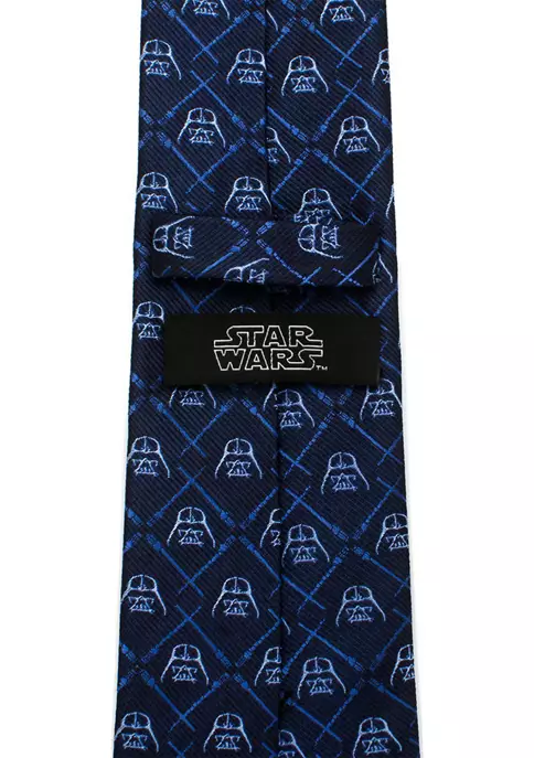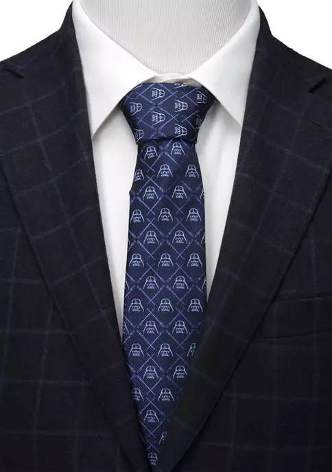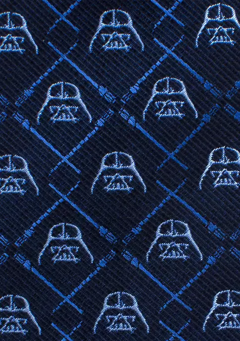 Deep navy blue forms the background color to this 100% silk tie. Contrasting pale and azure blue Darth Vader helmets and lightsabers criss-cross in front, to create a unique and simple pattern that’s perfect for every Star Wars fan. Wear alone or pair with any of our coordinating Darth Vader tie bars and cufflinks. Officially licensed by Lucasfilm, LTD.