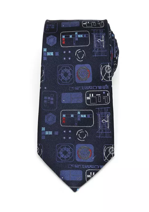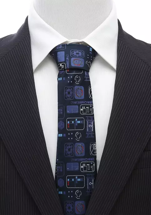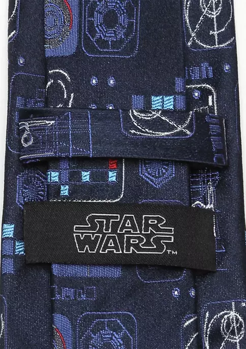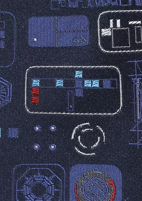 Design elements snatched from the dashboard of an Episode IX TIE fighter are featured together on this 100% silk tie. Navy blues, shining silvers, bright azures and crimson reds all combine to create a tie that’s as interesting to explore as the movies that inspired it. Officially licensed by Lucasfilm LTD.