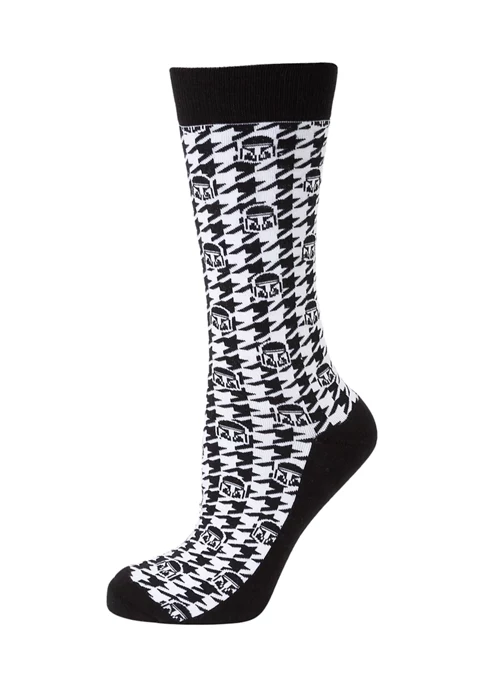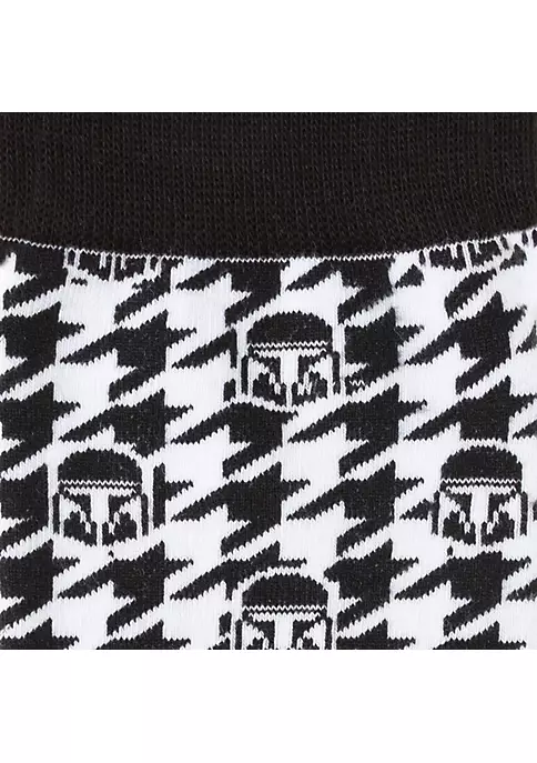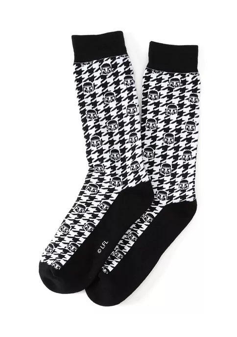 Members of the Mandalorian Guild never take off their helmets, but hopefully they still change their socks every day. We reckon that their socks probably look just like these, with a bold black and white houndstooth pattern and miniature helmet logos. Cushiony-soft with a comfortable calf band to keep them in place all day long, these socks are about to become part of your armor too. Officially licensed by Lucasfilm LTD.