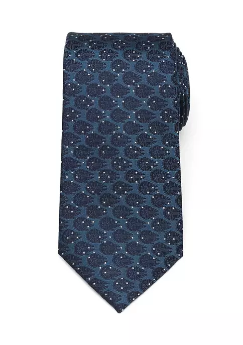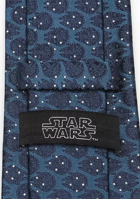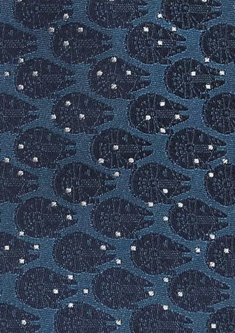 Iridescent teal and electric blue threads combine to form this elegant 100% silk tie. The Millennium Falcon darts across in neat rows, covered in a series of tiny silver dots reminiscent of all the stars in a galaxy far, far away. You’ve never seen a tie quite like this before. Officially licensed by Lucasfilm LTD.