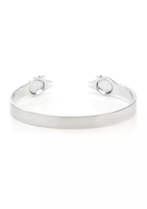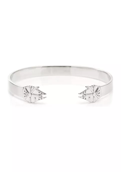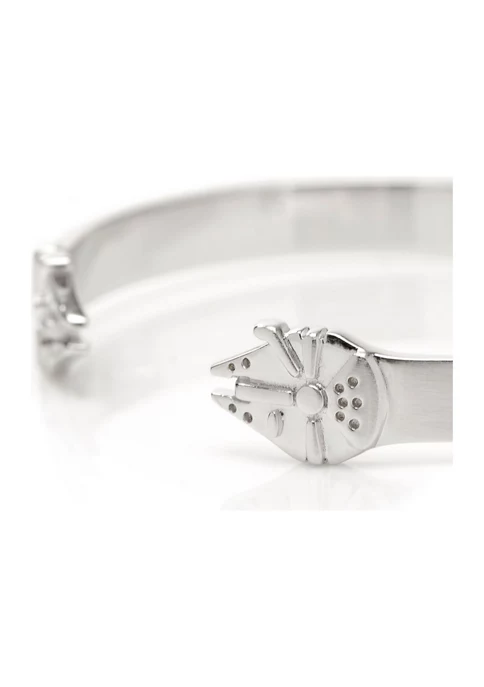 This slim and simple cuff bracelet features your favorite ship from Star Wars, the Millenium Falcon. Made from Stainless Steel, this cuff sits comfortably on your wrist while sporting a subtle yet sleek design. Perfect for lovers of the Millenium Falcon itself or the Star Wars universe. Pairs well with our other Millenium Falcon accessories. Officially licensed by Lucasfilm LTD.