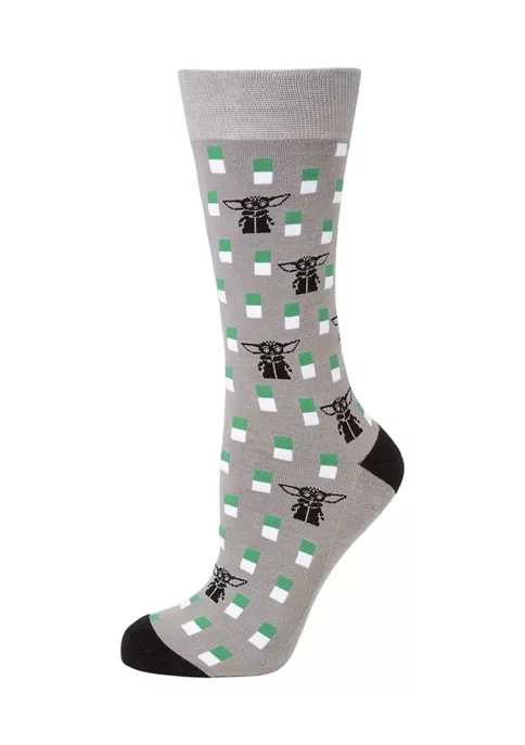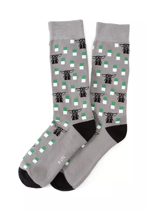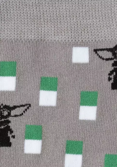 A little guy with a whole lotta power. Keep The Child close at hand… or foot… with this pair of gray and black socks. Featuring a series of images of The Child contrasted with a modernist pattern of green and white blocks, these cushiony-soft socks also have a comfortable calf band to keep them in place all day long. Officially licensed by Lucasfilm LTD.