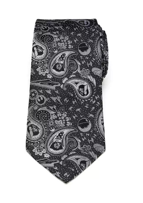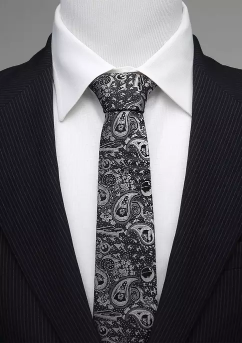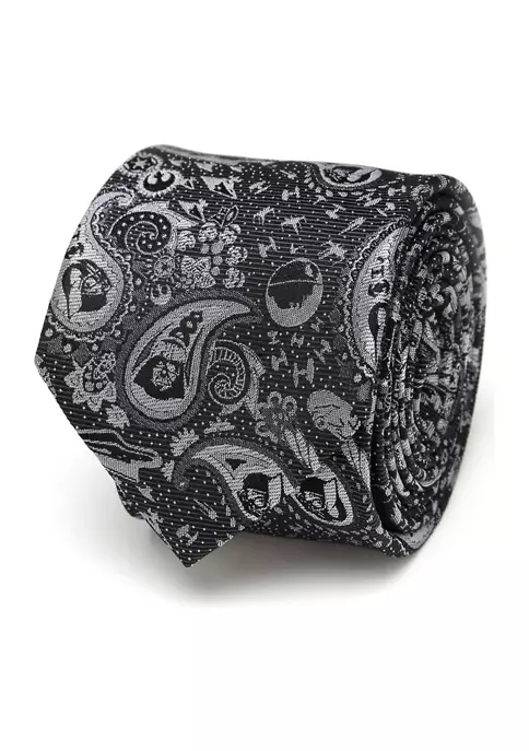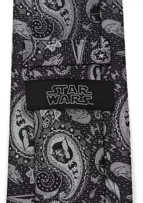 You’ll enjoy hours of entertainment admiring the impressive detail of this 100% silk tie. Carefully stitched in black and white silk, our design features miniature Darth Vader helmets, Imperial and Rebellion icons, Stormtroopers, a flying Millennium Falcon, and so much more. How many details can you find? Officially licensed by Lucasfilm LTD.
